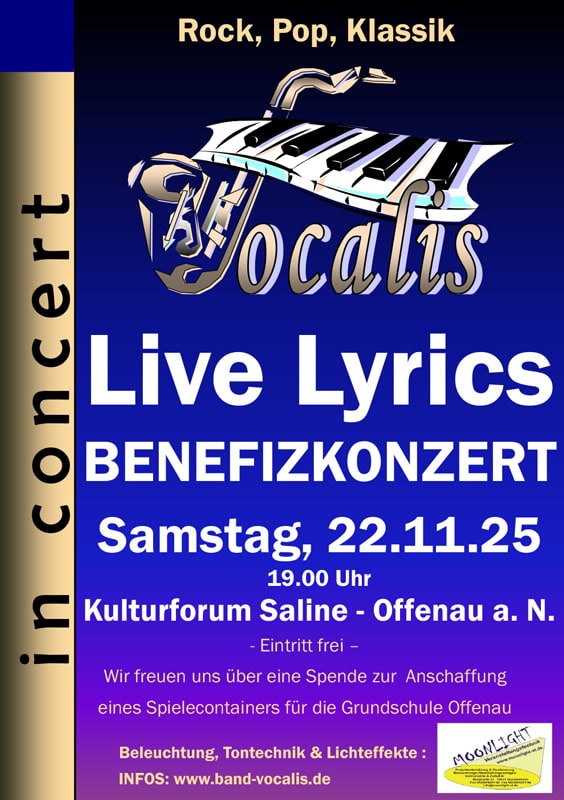 2025 ist es wieder soweit: Zum 12. Mal „VOCALIS IN CONCERT“ – und zum 5. Mal Live Lyrics mit einem komplett neuen Programm aus der Rock- und Popgeschichte der letzten 5 Jahrzehnte mit eigentlich bekannten, oder doch vielleicht gar nicht so bekannten Liedern und Texten.